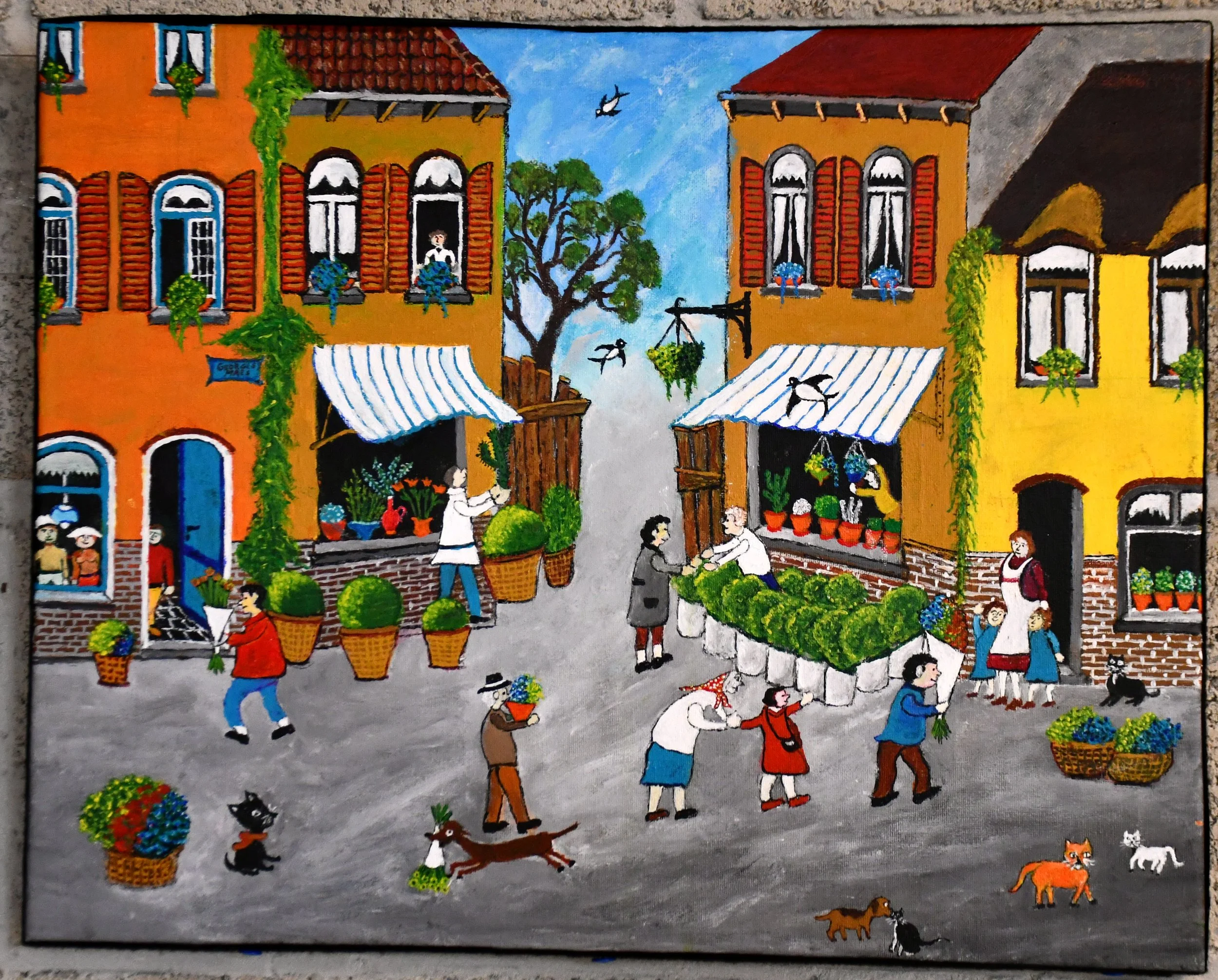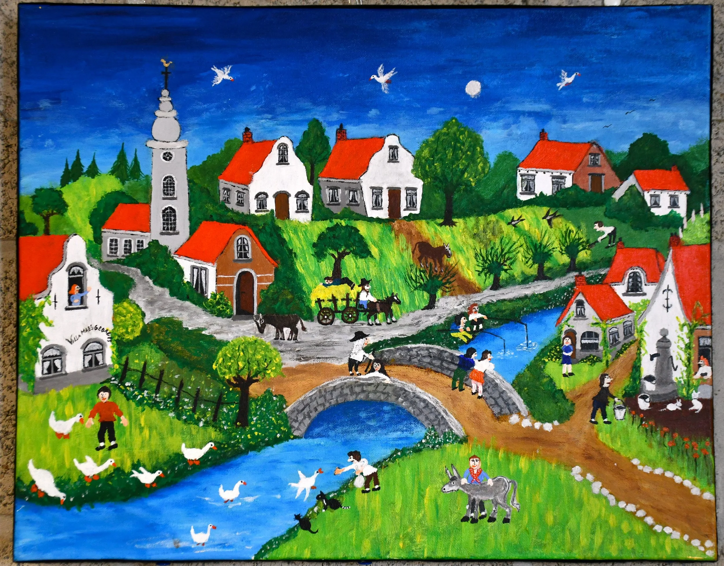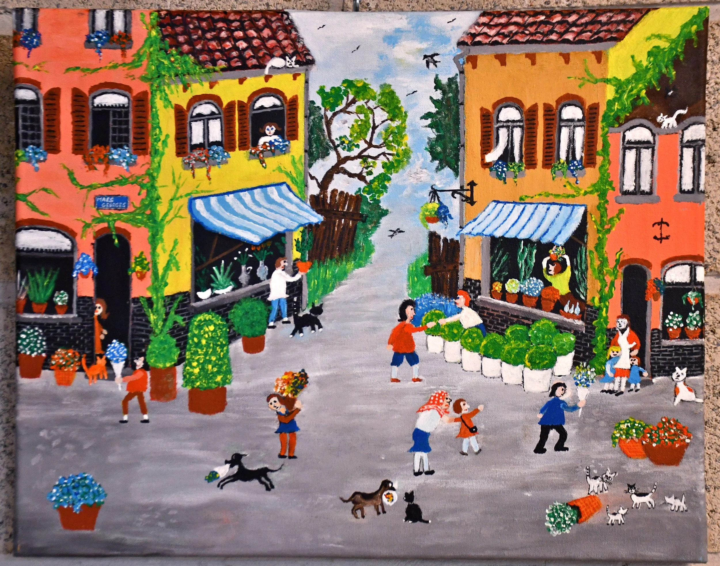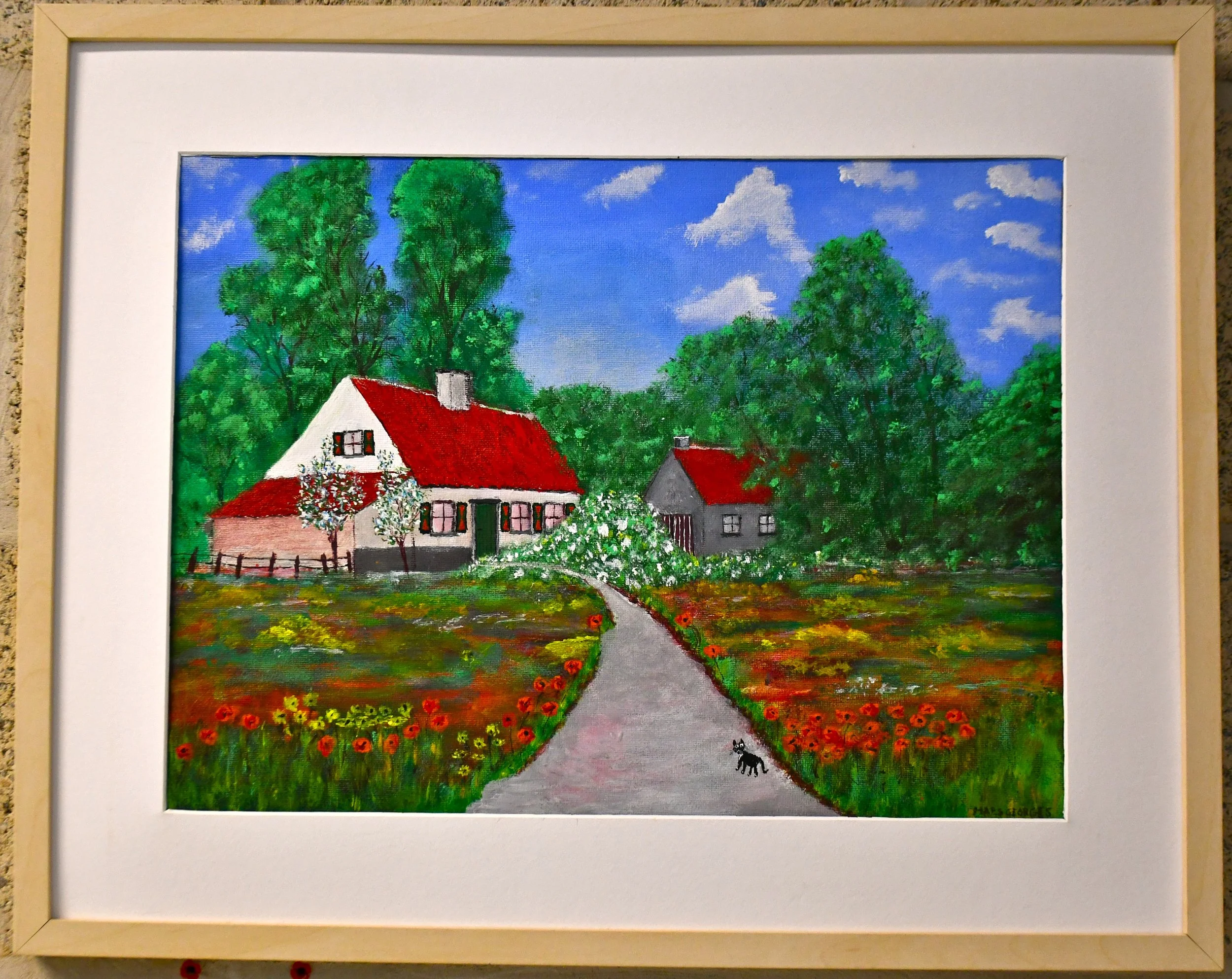 De laatste twee jaar , toen zijn fijne motoriek achteruitging en hij het penseeltje met één haar met een hulpstuk moest vasthouden, paste hij zijn stijl aan zoals de echte kunstenaars dat ook wel eens doen: de kleurrijke velden met de fiets , het exotische strand … papa was nog lang niet uitgeschilderd. Net zoals hij uren genoot van het schilderen, het soms herschilderen laag op laag tot de wolken de juiste kleur kregen , zo kan ik nog uren met bewondering over mijn papa vertellen.