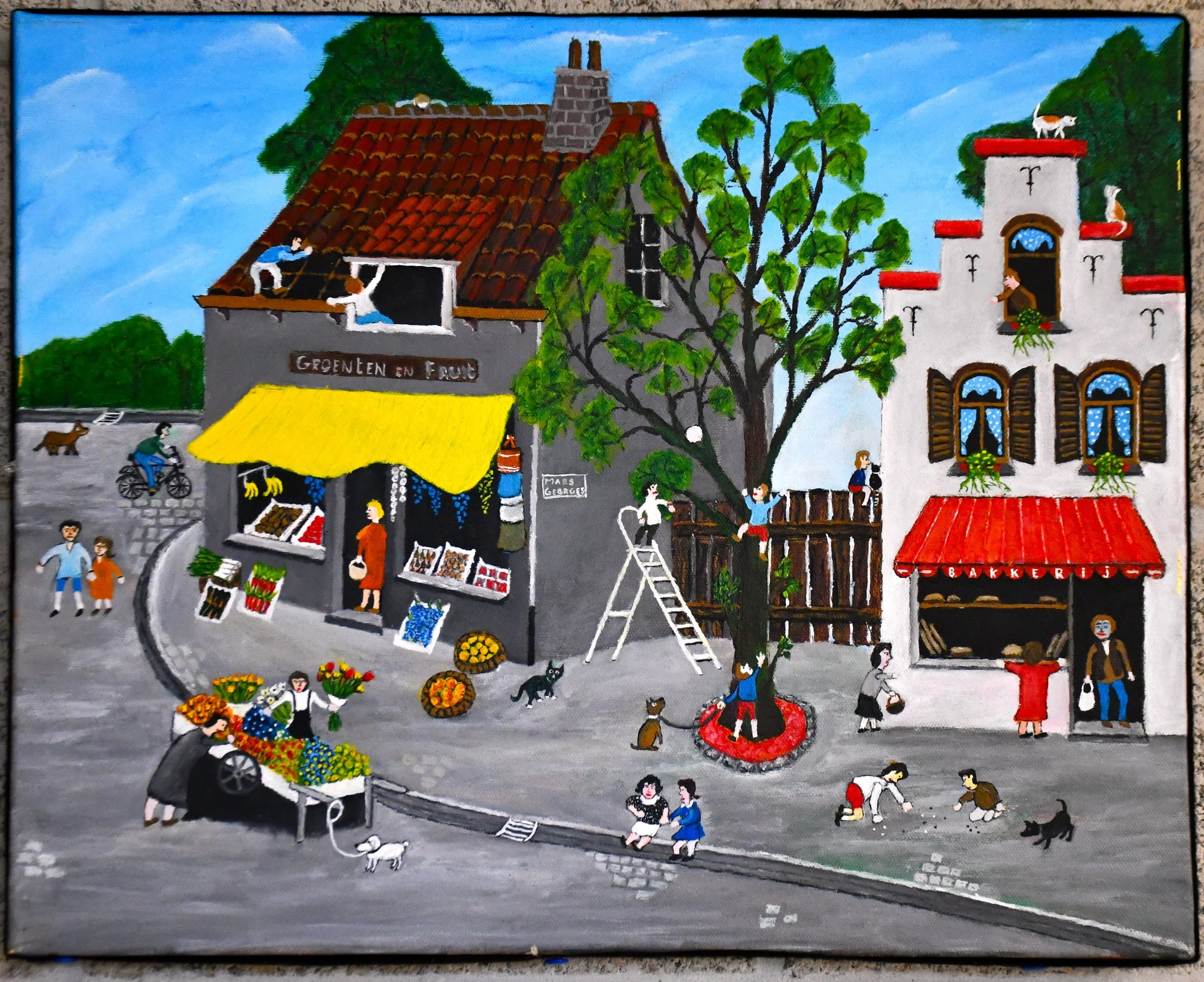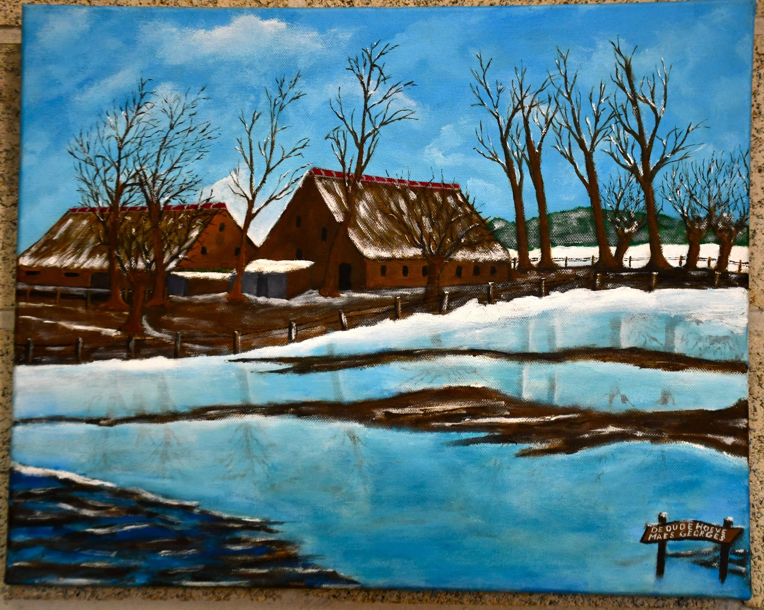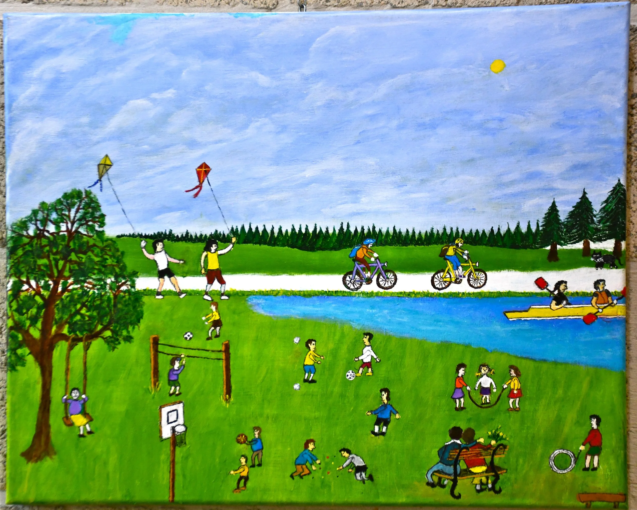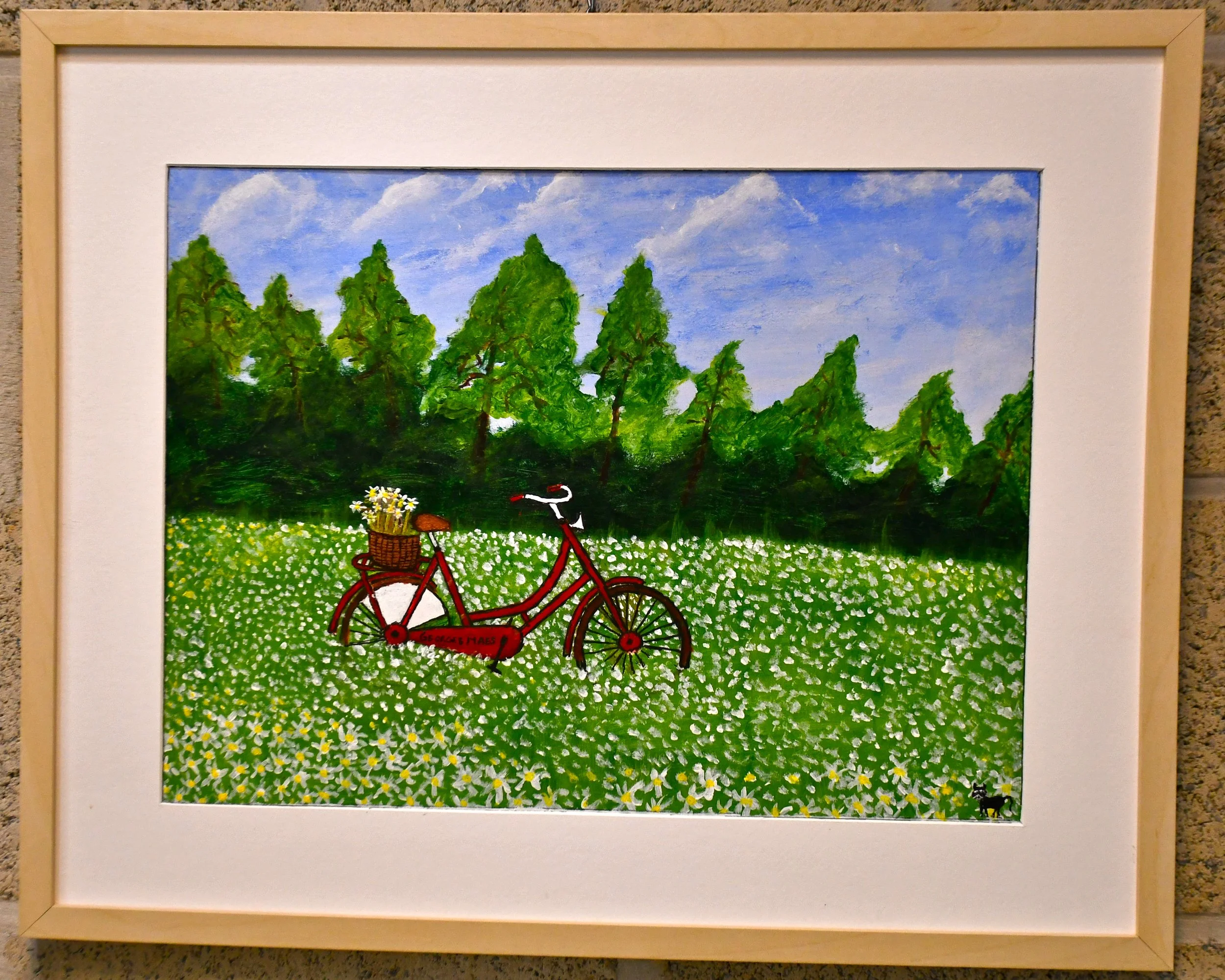 De laatste twee jaar , toen zijn fijne motoriek achteruitging en hij het penseeltje met één haar met een hulpstuk moest vasthouden, paste hij zijn stijl aan zoals de echte kunstenaars dat ook wel eens doen: de kleurrijke velden met de fiets , het exotische strand … papa was nog lang niet uitgeschilderd. Net zoals hij uren genoot van het schilderen, het soms herschilderen laag op laag tot de wolken de juiste kleur kregen , zo kan ik nog uren met bewondering over mijn papa vertellen.