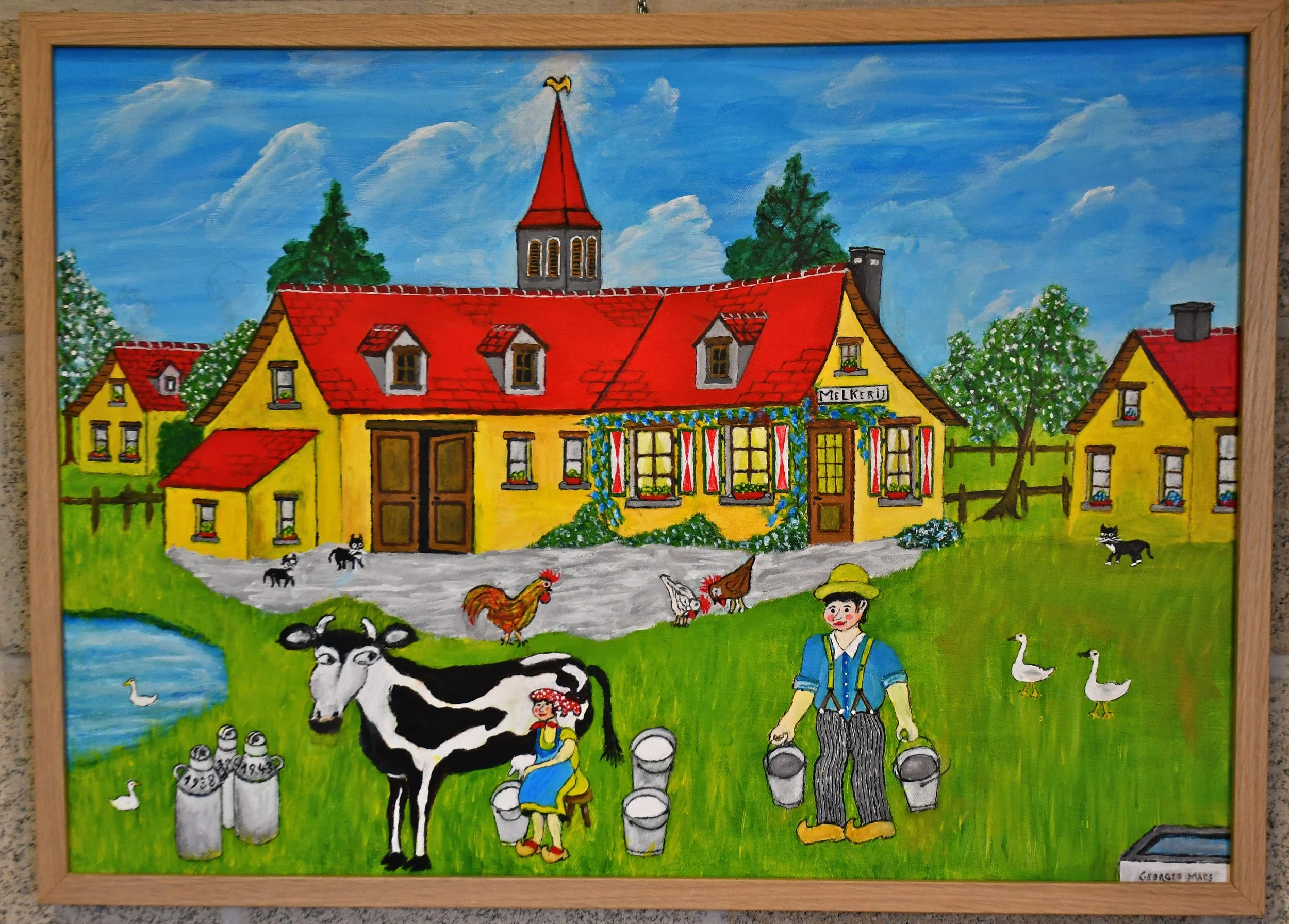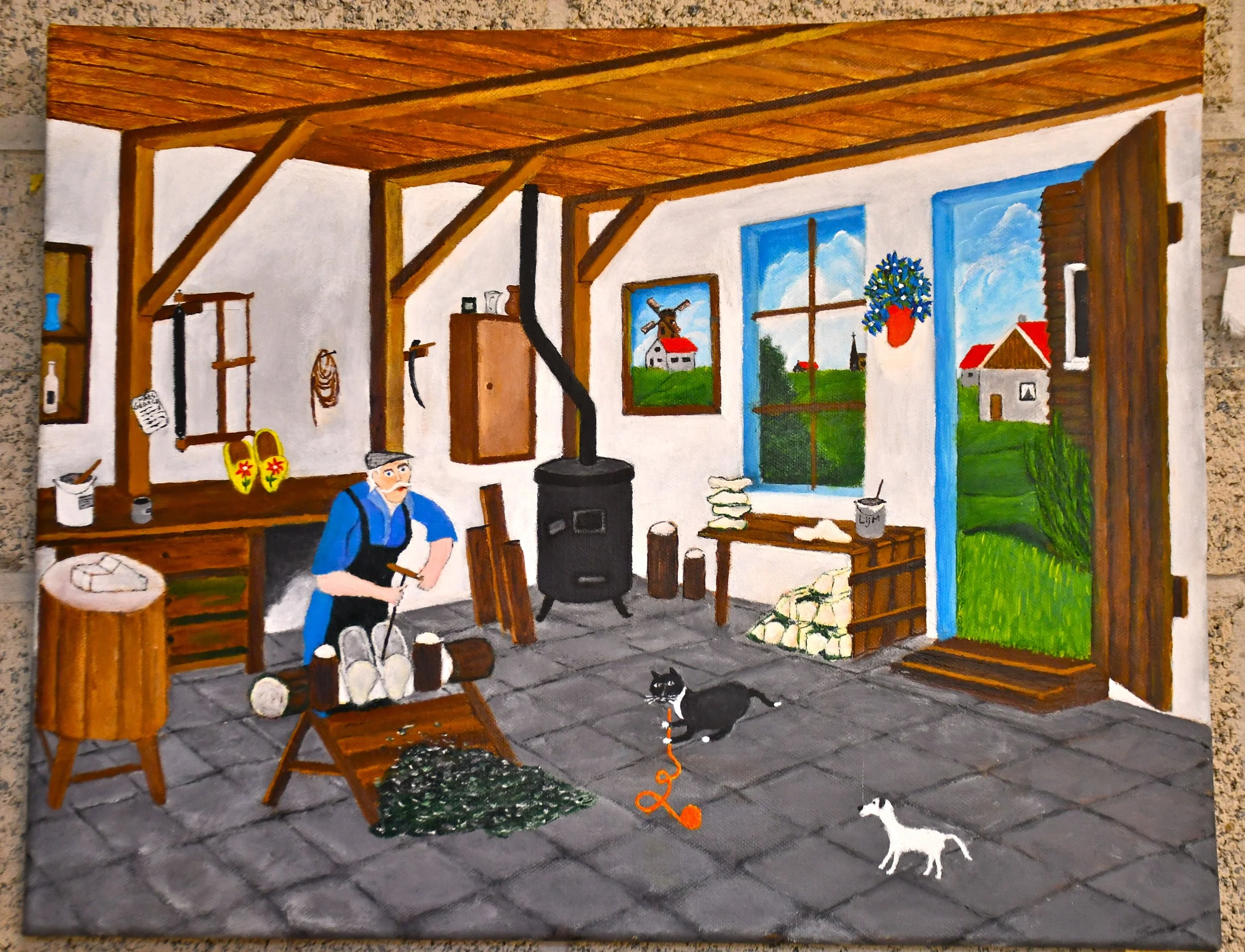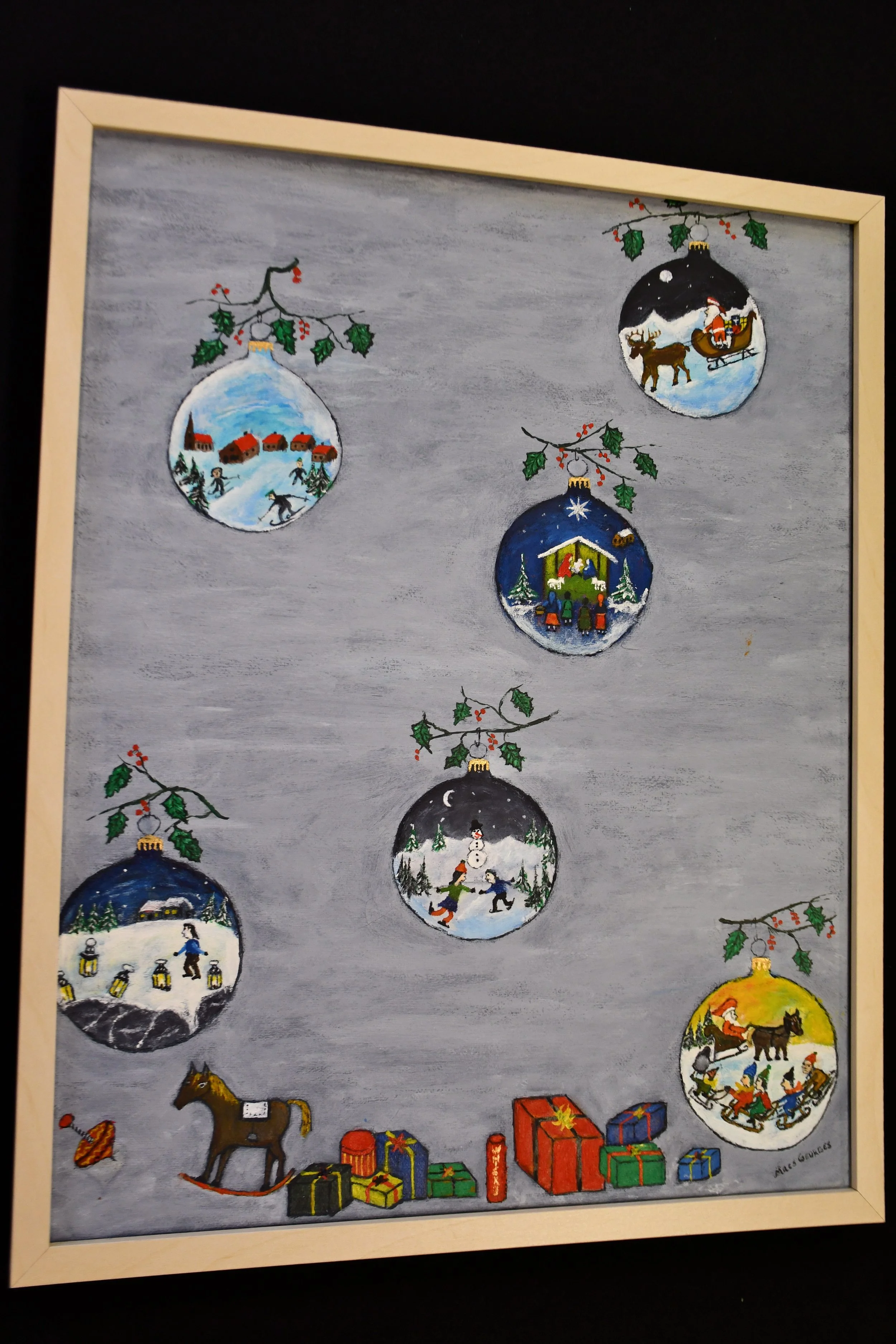 Zo genoot hij uren aan de livingtafel , dan eens met schilderijtjes , dan weer kerstballen , vogelhuisjes of spaarpotten. Zijn kunst was zo minimalistisch dat ze spontaan een glimlach op het gezicht tovert. Papa maakte fantasie : een kaasdoos van la vache qui rit , een eierdoos waar hij een nestje en een kip uitsneed , een boterke op de kersttafel waar hij de initialen G en B